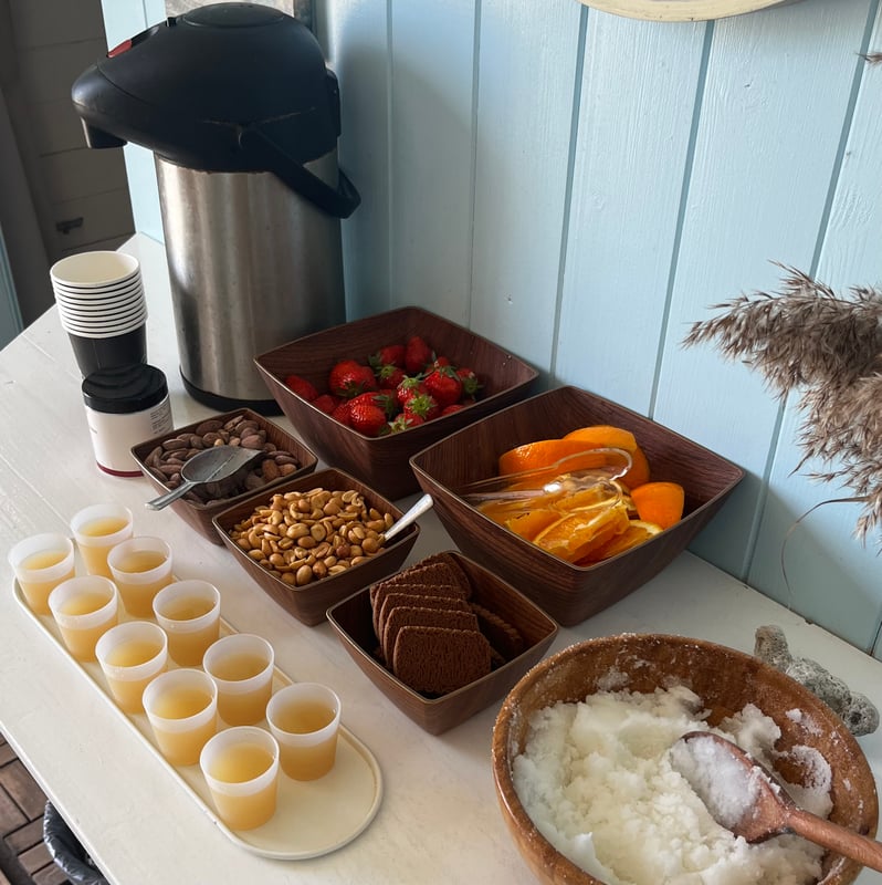Derudover kan du i pauserne nyde frisk frugt, snacks og varm the. Efter sidste runde tilbyder vi en lækker hjemmelavet saltscrub, der består af mandelolie, salt og velduftende æteriske olier.